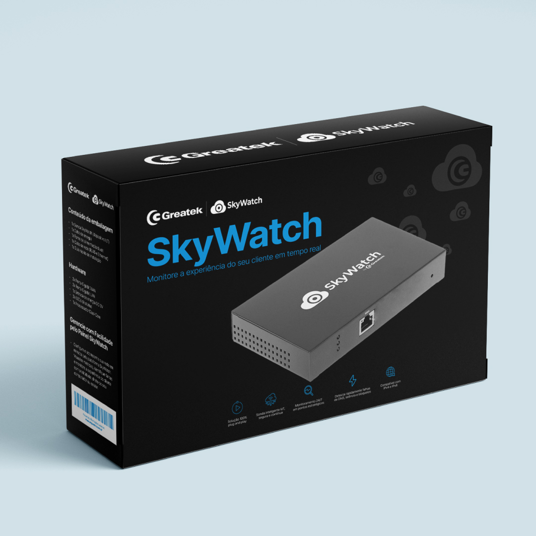 O SkyWatch é a solução da Greatek para monitoramento avançado de redes em ISPs e telecom. Com sondas plug-and-play e análise em Camada 7, acompanha DNS, latência, disponibilidade e processamento em tempo real, entregando visibilidade completa da experiência do usuário e permitindo atuação proativa no NOC.